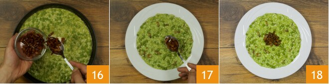 Fügt auch 2/3 des angebratenen Specks hinzu 16 und rührt um. Richtet das Risotto an, indem ihr auf die Oberfläche jedes Tellers einen Löffel Speck gebt 17. So ist das Risotto mit Speck und Erbsencreme servierfertig.