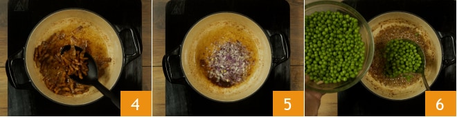 Bratet bei starker Hitze an, und wenn der Speck knusprig geworden ist, stellt ihn zur Seite 4. Gebt nun die gehackte Zwiebel in das Bratfett und lasst sie für ein paar Minuten bei starker Hitze schmoren 5. Anschließend fügt die Hälfte der Erbsen hinzu 6.