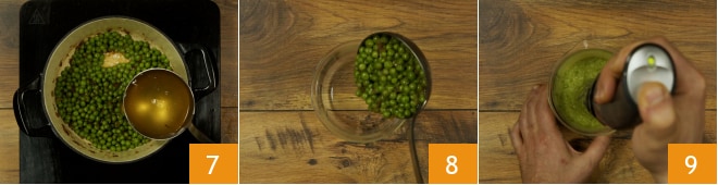 Gießt eine Kelle Brühe hinzu 7 und schmeckt mit Salz ab, lasst es etwa 5 Minuten kochen. Übertragt alles in den Becher eines Stabmixers 8 und püriert es zu einer glatten Creme 9.