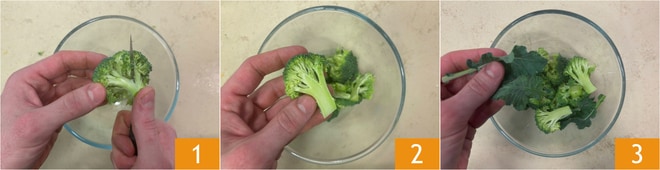 Um den Risotto mit Stracchino, Brokkoli und Sardellen zuzubereiten, reinigen Sie zuerst die Brokkoli, nehmen Sie 4 größere Röschen, insgesamt etwa 100 g 1, und halbieren Sie sie 2. Fügen Sie auch die grünen Blätter zu den Röschen hinzu 3.