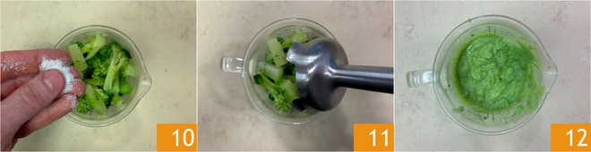 Mit Salz abschmecken 10 und mit einem Stabmixer pürieren 11, bis eine cremige und homogene Mischung entsteht 12, und beiseite stellen.