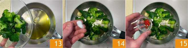 In einer Pfanne Öl und Knoblauch erhitzen, dann die zuvor blanchierten Brokkoliröschen und -blätter hinzufügen 13. Mit Salz abschmecken 14, in Ringe geschnittenen Chili hinzufügen 15 und einige Minuten braten, beiseite stellen.
