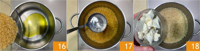 In einem Topf einen Esslöffel Öl erhitzen, den Reis hinzufügen 16 und unter häufigem Rühren anrösten. Mit heißem Wasser oder heißer Gemüsebrühe aufgießen 17, bis er bedeckt ist. Den Reis unter Zugabe weiterer Flüssigkeit bei Bedarf garen. Wenn der Reis gar ist, nehmen Sie ihn vom Herd und fügen den Stracchino hinzu 18.