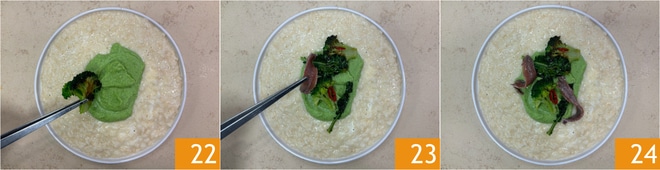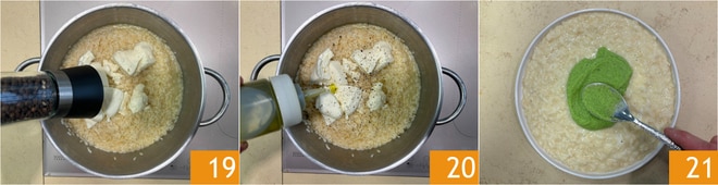 Mit Salz und Pfeffer abschmecken 19, einen Schuss Öl hinzufügen 20 und vermengen. Den Reis anrichten und in die Mitte einen Löffel Brokkolicreme geben 21.