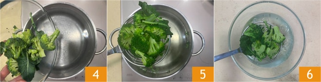 Blanchieren Sie sie für 4 Minuten 4, abseihen 5 und in einer Schüssel mit Eiswasser abkühlen 6, erneut abseihen und beiseite stellen.