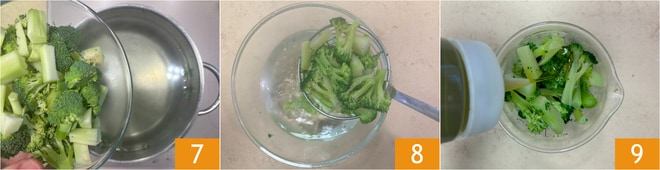 Währenddessen den Rest der Brokkoli in Röschen teilen; dann den Stiel schälen und in Stücke schneiden. Auch den restlichen Teil der Brokkoli für 10 Minuten blanchieren 7 und in Eiswasser abkühlen. Abseihen 8, alles in einen hohen Behälter geben und mit Öl würzen 9.