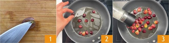 Um das Risotto mit Wein, Trauben und Ziegenkäse zuzubereiten, waschen Sie zunächst die Traubenbeeren und halbieren Sie sie, dann entfernen Sie die inneren Kerne 1. Erhitzen Sie etwas Öl in einer Pfanne und legen Sie die Trauben mit der Schnittseite nach unten 2. Braten Sie die Traubenbeeren ein paar Minuten an, dann salzen Sie sie 3 und stellen Sie sie beiseite.