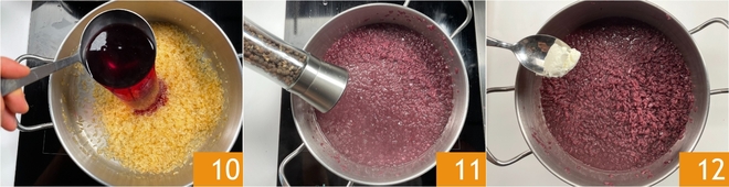 Gießen Sie die Gemüsebrühe und den Rotwein in einen Topf 7, bringen Sie es zum Kochen und halten Sie es warm. Nehmen Sie den Topf wieder, in dem Sie die Zwiebel gegart haben, und rösten Sie den Reis bei mittlerer bis hoher Hitze etwa 5 Minuten lang, häufig umrühren 8. Wenn die Körner schön heiß sind, fügen Sie die Zwiebel hinzu 9.