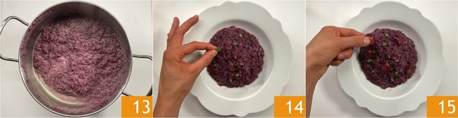 Rühren Sie gut, um alles zu vermischen 13. Garnieren Sie die Teller mit ein paar Majoranblättchen 14 und den sautierten Traubenbeeren 15. Ihr Risotto mit Wein, Trauben und Ziegenkäse ist bereit zum Servieren!