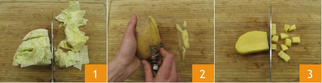 Um das Risotto mit Wirsing und Kartoffeln zuzubereiten, beginnen wir mit dem Wirsing. Entfernen Sie den Strunk und schneiden Sie ihn in Stücke von 3 cm 1. Dann kommen die Kartoffeln, schälen Sie sie 2 und schneiden Sie sie in Würfel von 1 cm 3.