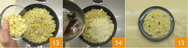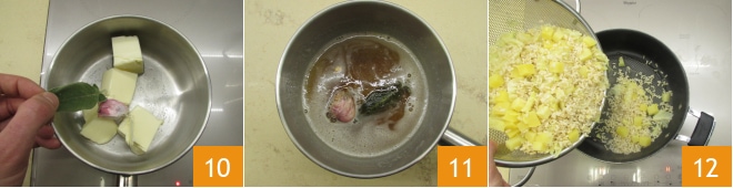 Erhitzen Sie alles bei niedriger Temperatur und fügen Sie die Valtellina Casera-Würfel 13, den geriebenen Grana Padano DOP 14 und das Buttersauce (aus der Sie den Knoblauch entfernt haben) 14 hinzu. Mischen Sie alles gut, nehmen Sie die Pfanne vom Feuer und servieren Sie Ihr Risotto mit Wirsing und Kartoffeln, garniert mit frischen Salbeiblättern 15.