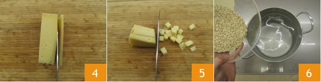 Zuletzt entfernen Sie die Rinde vom Valtellina Casera-Käse 4 und schneiden ihn in Würfel von etwa 1 cm 5. Jetzt gehen Sie an den Herd. In einen Topf mit kochendem Salzwasser geben Sie den Vollkornreis 6,