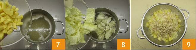 zusammen mit den Kartoffelwürfeln 7 und den Wirsingstücken 8. Kochen Sie alles 15 Minuten, abtropfen lassen und zur Seite stellen 9.