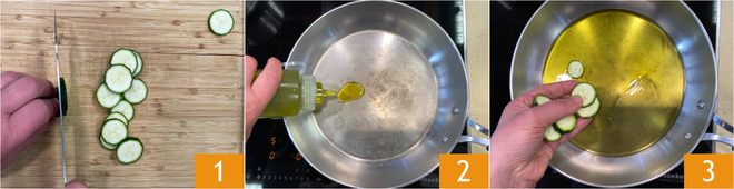 Um den Risotto mit Zucchini und Salsiccia zuzubereiten, zuerst die Zucchini am Stielansatz abschneiden und in dünne Scheiben schneiden 1. Geben Sie reichlich Olivenöl in eine Pfanne 2 und wenn es heiß ist, fügen Sie ein Drittel der Zucchinischeiben hinzu 3.