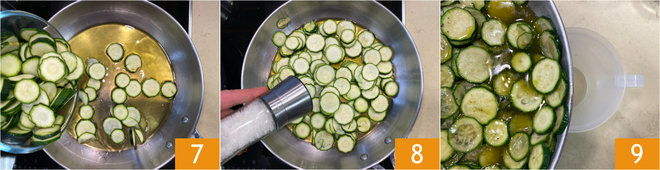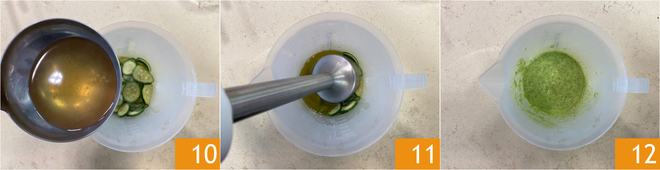 Geben Sie in derselben Pfanne die restlichen Zucchini 7, salzen Sie leicht 8 und garen Sie sie bei mittlerer Hitze etwa 10 Minuten. Wenn sie weich sind, die Zucchini in einen Mixbecher geben 9.