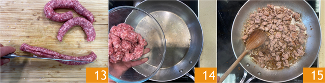 Kommen wir zur Salsiccia: Die Pelle einschneiden und entfernen 13. Die Pfanne, in der Sie die Zucchini gebraten haben, erhitzen, die Salsiccia hineingeben 14 und bei mittlerer Hitze ein paar Minuten anbraten, dabei mit einem Holzlöffel zerbröseln 15. Sobald sie durchgegart und goldbraun ist, vom Herd nehmen und beiseitestellen.