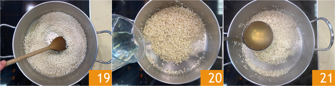 Den Reis 1–2 Minuten unter häufigem Rühren anrösten 19. Mit dem Weißwein ablöschen 20 und die alkoholische Note vollständig verdampfen lassen. Dann den Reis fertig garen, indem Sie nach und nach jeweils eine Kelle heiße Brühe hinzufügen und erst wieder nachgießen, wenn die Flüssigkeit aufgenommen wurde 21.