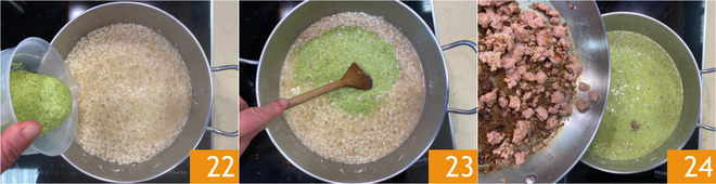 Nach etwa 10 Minuten etwa zwei Drittel der Zucchini-Creme unterrühren 22 und gut vermischen, damit der Reis gleichmäßig gewürzt ist 23. Die angebratene Salsiccia einarbeiten 24 und den Risotto fertig garen – das dauert etwa 5 Minuten.