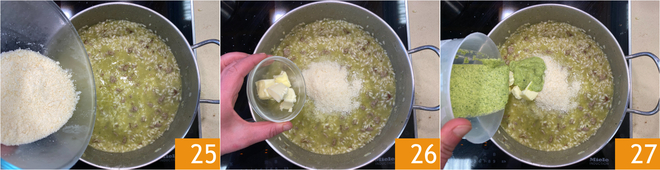 Sobald der Reis gar ist, den Herd ausschalten und mit frisch geriebenem Parmigiano Reggiano 25, kalter Butter 26 und der restlichen Zucchini-Creme 27 verfeinern.