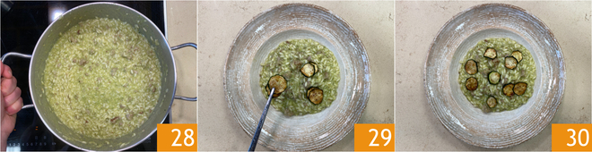 Alles gut verrühren, bis eine sämige, wellenförmige Konsistenz entsteht, dann ein paar Minuten ruhen lassen 28. Anrichten und mit den beiseitegestellten frittierten Zucchinischeiben garnieren 29. Ihr Risotto mit Zucchini und Salsiccia ist servierfertig 30!