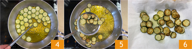 Frittieren Sie die Scheiben und wenden Sie sie dabei, sodass sie von beiden Seiten goldbraun werden 4. Sobald sie goldbraun sind, abtropfen lassen 5 und auf Küchenpapier legen 6. Beiseitestellen.