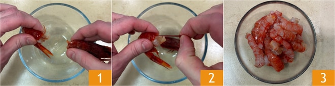 Um den Risotto mit Zucchinicreme und rohen Garnelen zuzubereiten, reinigen Sie zuerst die Garnelen. Entfernen Sie den Kopf 1 und den Darm 2, dann schälen Sie das Gehäuse 3 und legen Sie sie beiseite. Bewahren Sie die Köpfe und Schalen auf, sie werden für die Zubereitung der Fischbrühe benötigt.