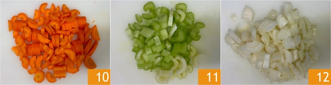 Schälen und schneiden Sie die Karotten 10, den Sellerie 11 und die Zwiebel 12 in kleine Stücke.