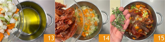 Erhitzen Sie das Öl in einem Topf, fügen Sie das Gemüse 13, die Garnelenschalen 14 und den Majoran 15 hinzu.