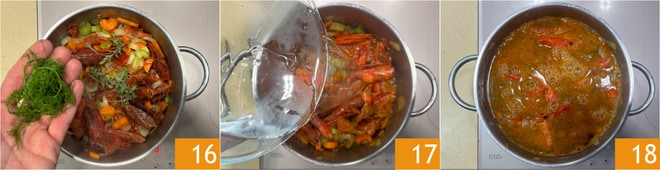 Fügen Sie auch den Dill 16 hinzu und braten Sie für ein paar Minuten an. Dann mit kaltem Wasser bedecken 17 und für 30 Minuten kochen 18.