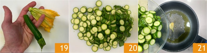 In der Zwischenzeit trennen Sie die Zucchini von den Blüten 19 und schneiden Sie sie in Scheiben 20. Geben Sie Öl in eine Pfanne, fügen Sie eine Knoblauchzehe hinzu und braten Sie für ein paar Minuten an, dann fügen Sie die Zucchini hinzu 21.