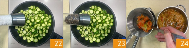 Würzen Sie mit Salz 22 und Pfeffer 23 und braten Sie für ein paar Minuten an. Nach der Kochzeit der Brühe, filtern Sie sie 24.