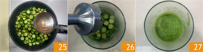 Fügen Sie einen Löffel Brühe zu den Zucchini hinzu 25 und kochen Sie für ein paar Minuten, gerade genug, um die Zucchini Geschmack zu verleihen. Entfernen Sie den Knoblauch und geben Sie alles in einen Mixer 26, pürieren Sie bis eine glatte und homogene Creme entsteht 27. Beiseite stellen.