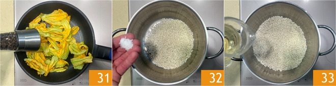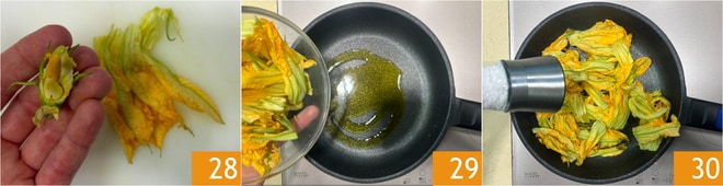 Reinigen Sie die Zucchiniblüten 28, geben Sie sie in eine Pfanne mit etwas Öl 29 und würzen Sie mit Salz 30.
