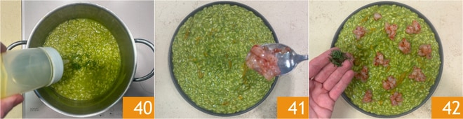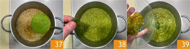 Wenn noch 2 Minuten bis zur Beendigung des Kochens des Reises fehlen, fügen Sie die Zucchinicreme hinzu 37 und schalten Sie das Feuer aus. Fügen Sie die Minze 38 und die Zucchiniblüten 39 hinzu.