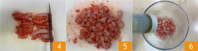 Schneiden Sie die Garnelen 4 in sehr kleine Stücke 5, dann geben Sie sie in eine Schüssel und würzen mit etwas Öl 6.
