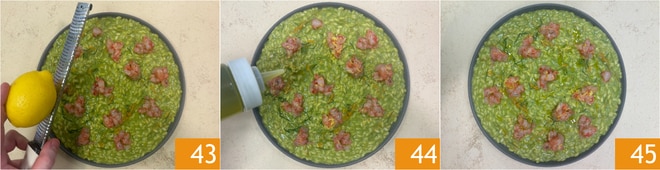 Vervollständigen Sie mit geriebener Zitronenschale 43 und einem Spritzer rohem Öl 44. Der Risotto mit Zucchinicreme und rohen Garnelen ist bereit, serviert zu werden 45!