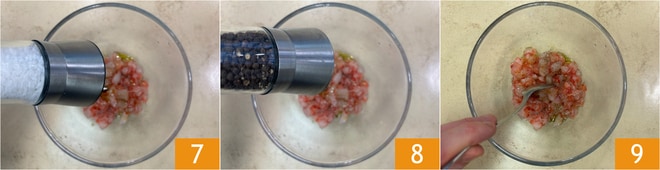 Fügen Sie Salz 7 und Pfeffer 8 hinzu. Mischen Sie 9 und stellen Sie es beiseite.