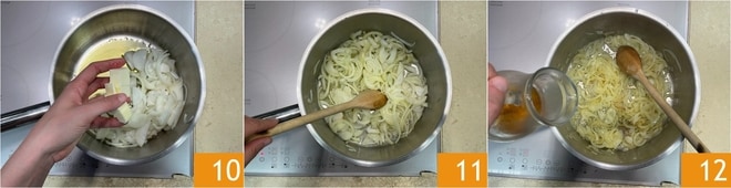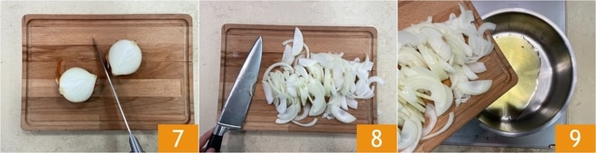 In der Zwischenzeit bereiten Sie auch die Zwiebeln vor. Schälen Sie sie und schneiden Sie sie zuerst in Hälften 7 und dann in dünne Scheiben 8. Geben Sie etwas Öl und die Zwiebeln in einen Topf 9.