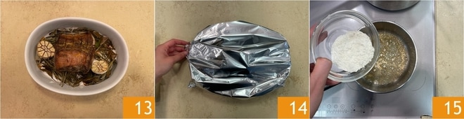 Wenn das Roastbeef fertig ist, nehmen Sie es aus dem Ofen 13 und decken es mit einem Blatt Aluminiumfolie ab 14. Lassen Sie es mindestens 15 Minuten ruhen. In der Zwischenzeit bereiten Sie die Sauce vor. Geben Sie die Butter in einen kleinen Topf und lassen Sie sie schmelzen. Fügen Sie das Mehl auf einmal hinzu 15.