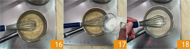 Rühren Sie schnell mit einem Schneebesen, bis ein goldbrauner Roux entsteht 16. Gießen Sie dann die Milch ein 17 und rühren Sie gut mit einem Schneebesen 18, um Klumpen zu vermeiden.