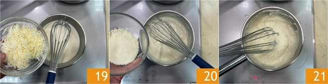 Sobald die Sauce anfängt, dick zu werden, fügen Sie den geriebenen Comté-Käse 19 und den geriebenen Parmigiano Reggiano DOP 20 hinzu. Würzen Sie mit Pfeffer und rühren Sie weiter, bis die Käse geschmolzen sind 21.