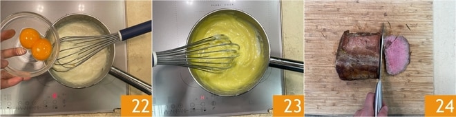 Geben Sie die beiden Eigelbe hinzu 22 und rühren Sie, bis sie gut eingearbeitet sind 23. Jetzt schneiden Sie das Fleisch in dünne Scheiben 24.
