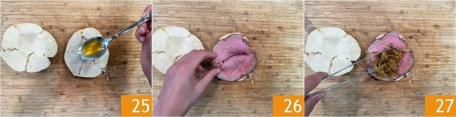 Schneiden Sie das Brötchen in zwei Hälften und rösten Sie es, wenn Sie möchten, in der Pfanne. Tränken Sie das Brot in den Fleischsäften 25, dann legen Sie ein paar Scheiben hinein 26. Fügen Sie die karamellisierten Zwiebeln hinzu 27.