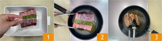 Um das Sandwich mit Roastbeef und karamellisierten Zwiebeln zuzubereiten, beginnen Sie mit dem Fleisch. Sie benötigen ein bereits mit einem Rosmarinzweig gebundenes Stück. Tupfen Sie das Fleisch ab und salzen Sie es großzügig 1, dann geben Sie es in eine Pfanne mit einem Schuss heißem Öl 2 und braten es auf allen Seiten gut an, um es scharf anzubraten 3 bei hoher Hitze.
