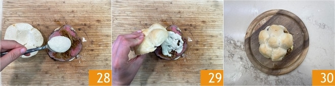 Beenden Sie mit der Sauce 28. Schließen Sie das Sandwich 29 und servieren Sie es 30.