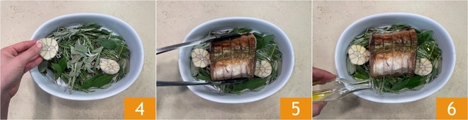 In der Zwischenzeit legen Sie in eine Ofenform die aromatischen Kräuter und die halbierte Knoblauchknolle 4. Wenn das Fleisch gut angebraten ist, legen Sie es auf die Gewürze 5 und fügen Sie einen Schuss Öl hinzu 6. Backen Sie es im vorgeheizten statischen Ofen bei 220°C für 15 Minuten, dann senken Sie die Temperatur auf 180°C und backen es noch 11 Minuten weiter. Sie sollten eine Innentemperatur von 48-50°C erreichen, die Sie mit einer Sonde messen können.