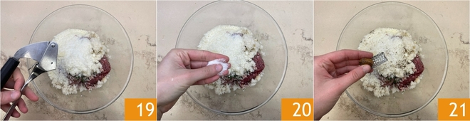 Kneten Sie alles mit den Händen 22, bis Sie eine homogene Mischung 23 erhalten. Formen Sie nun die Fleischbällchen, indem Sie etwa 100 g der Mischung entnehmen und sie nach und nach auf ein Tablett legen 24.