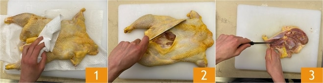 Um den Rollbraten von Kapaun mit Selleriepüree zuzubereiten, stellen Sie als erstes den braunen Fond her, Sie können unser Rezept dafür verwenden. Dann nehmen Sie einen in der Metzgerei entbeinten Kapaun. Brennen Sie eventuelle Federn mit einem Bunsenbrenner ab, waschen Sie ihn dann unter Wasser und tupfen Sie ihn trocken 1. Trennen Sie die Keulen von der Brust 2, dann auch diese entbeinen, indem Sie den Mittelteilknochen entfernen und sie plattdrücken 3.