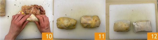 Nun rollen Sie sie auf 10. Machen Sie dasselbe mit der anderen Keule 11. Wickeln Sie sie dann in Backpapier ein 12.