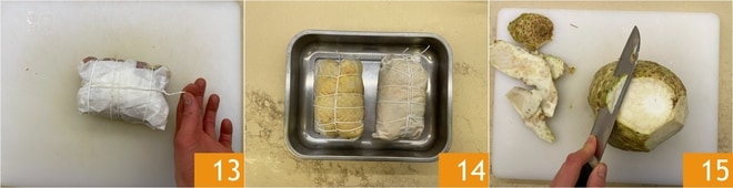 Binden Sie sie mit Küchengarn, als ob es ein Braten wäre 13, und legen Sie sie in eine Backform 14. Stellen Sie eine mit Wasser gefüllte Backform auf die untere Schiene des Ofens, um einen Dampfeffekt zu erzeugen, heizen Sie den Ofen auf 180°C vor und stellen Sie die Backform mit dem Kapaun auf die obere Schiene. Backen Sie für 30 Minuten. In der Zwischenzeit bereiten Sie das Selleriepüree vor. Füllen Sie einen Topf mit Wasser, salzen Sie es und bringen Sie es zum Kochen. Schälen Sie dann die Sellerieknolle 15.